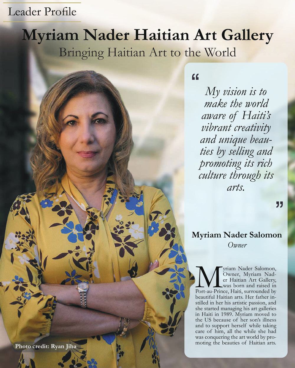 Hello and welcome! I’m Myriam Nader Salomon, founder of Myriam Nader Haitian Art Gallery, a trusted leader in Haitian art worldwide for nearly 30 years. Haitian art is diverse and deeply connected to its history, extending far beyond naive painters. It showcases the stories, struggles, and beauty of Haiti’s culture through both masterworks and contemporary artists. Our mission is to promote and preserve Haiti’s vibrant artistic heritage, connecting collectors globally with genuine Haitian paintings and sculptures. We offer expert Haitian art appraisals, personalized consultations, and secure worldwide shipping. Committed to originality, competitive pricing, and integrity, our goal is to transform every collector into a lifelong client while delivering an art-buying experience that exceeds expectations.