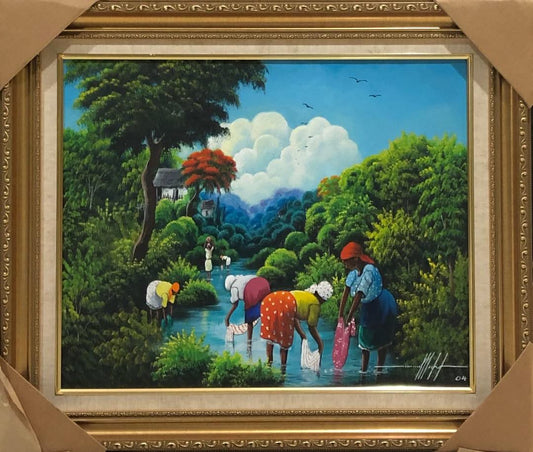 Simeon Michel 20"x24" Wash Day At The Stream Oil on Canvas Painting #26-SM