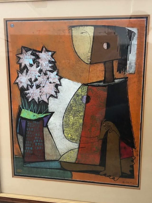 Angel Botello (1913-1986) 22"x18" 'MUJER CON FLORES' Unframed Hand-Signed A/P 10/10 N-Linocut Print #3SJ