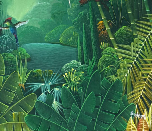 Albott Bonhomme 24"x20" Birds After The Rain In Lush Vegetation 2024 Acrylic on Canvas Painting #53MFN