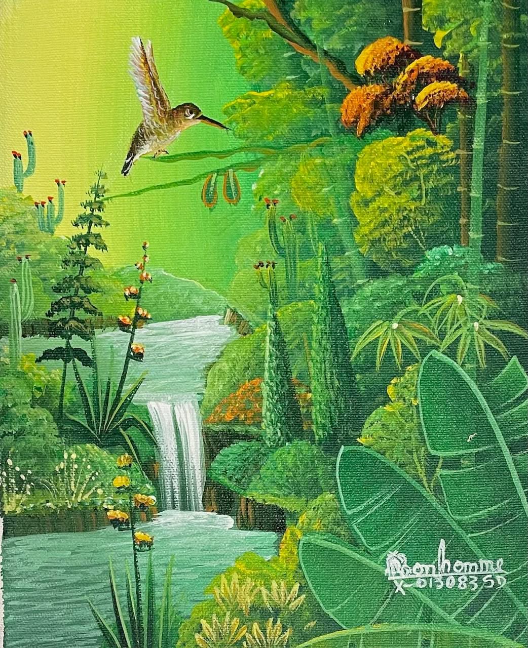 Albott Bonhomme painted this original 10"x 8" contemporary painting of a tropical paradise with a bird flying over a river in lush vegetation. It is an original canvas acrylic painting, signed on the lower right side, with the inscription X-013083SD below the signature. It sold unstretched and unframed and will be shipped from New York.