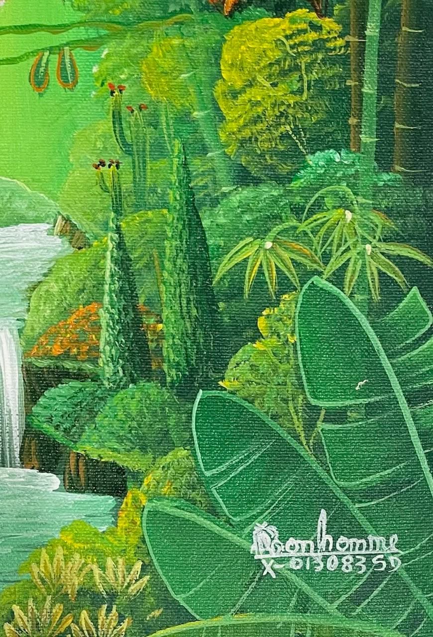 Self-taught artist Albott Bonhomme was born in 1963 in Port-de-Paix, Haiti. He became a professional artist in 1990 and painted birds in a lush oasis. He has been exhibited worldwide, and his art is appreciated by many collectors internationally, mainly in the US and Japan. His "Tropical forest scenes evoke the environmental problems confronting Haiti" (Peintres Haitiens by Gerald Alexis, Editions Cercle d'Art, 2000)