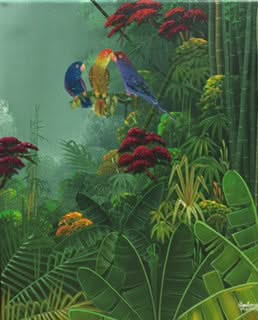 Albott Bonhomme was born in 1963 in Port-de Paix, Haiti. He is a self-taught artist who has developed a unique style depicting colorful birds in lush vegetation and the misty atmosphere of his imaginative tropical jungles n Haiti. He uses various tones of greens, and the birds are presented in vibrant colors. His name is cited in major Haitian books, and he has exhibited in Haiti, the US, and Japan.