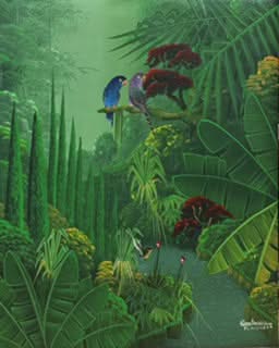 Albott Bonhomme was born in 1963 in Port-de Paix, Haiti. He is a self taught artist who has developed an unique style depicting colorful birds in lush vegetation and misty atmosphere of his imaginative tropical jungles n Haiti. He uses various tones of greens and the birds are presented in vibrant colors. His name is cited in major Haitian at books and he has exhibited in Haiti, the US, and Japan.