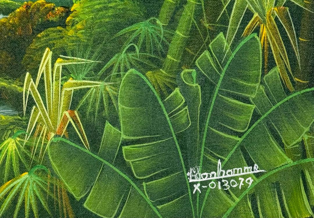Valley of Watchful Wings (2025) by Albott Bonhomme presents a lush tropical landscape shaped by depth, balance, and quiet observation. Dense vegetation—layered banana leaves, bamboo stalks, palms, and flowering plants—frames a winding waterway that descends through the center of the composition in a series of gentle cascades. The flowing river and waterfall guide the viewer’s eye inward, creating a sense of movement through an otherwise serene, enclosed environment. Three birds animate the upper register of the painting: two perched in quiet dialogue and another hovering nearby. Their presence introduces a subtle interplay between stillness and motion, suggesting vigilance, harmony, and continuity within the natural world. Bonhomme’s palette is dominated by nuanced greens, enriched with accents of red, yellow, and soft earth tones, producing a luminous atmosphere that feels both immersive and contemplative. Executed in acrylic on canvas, the painting reflects Bonhomme’s distinctive nature-inspired approach, blending careful observation with poetic imagination. The work speaks to themes of sanctuary, ecological balance, and the enduring rhythms of tropical landscapes, making it a compelling acquisition for collectors of Haitian art, Caribbean landscape painting, and contemporary works centered on flora and fauna.