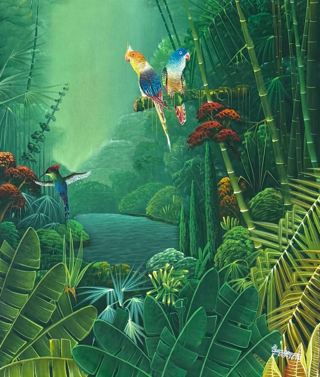 Self-taught artist Albott Bonhomme, born in 1963 in Port-de-Paix, Haiti, has established himself as a prominent figure in the art world since becoming a professional artist in 1990. His striking paintings of birds set against lush oasis environments capture the viewer's attention and ignite appreciation. Bonhomme's work has made its mark globally, with a strong following among collectors in the United States and Japan. As noted in "Peintres Haitiens" by Gerald Alexis (Editions Cercle d'Art, 2000), his "tropical forest scenes powerfully illustrate the environmental challenges facing Haiti." Don't hesitate to scroll down and explore his remarkable creations!