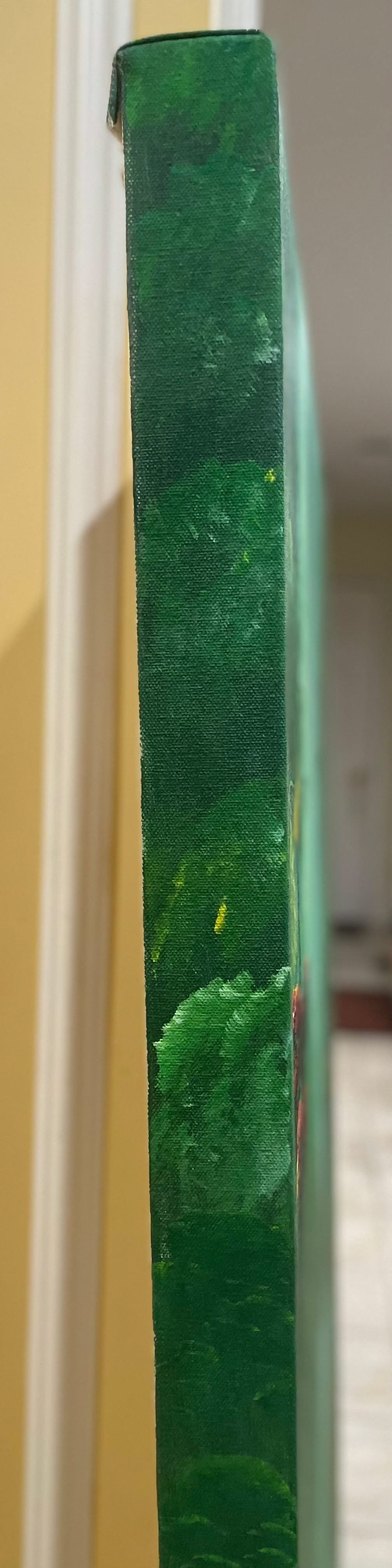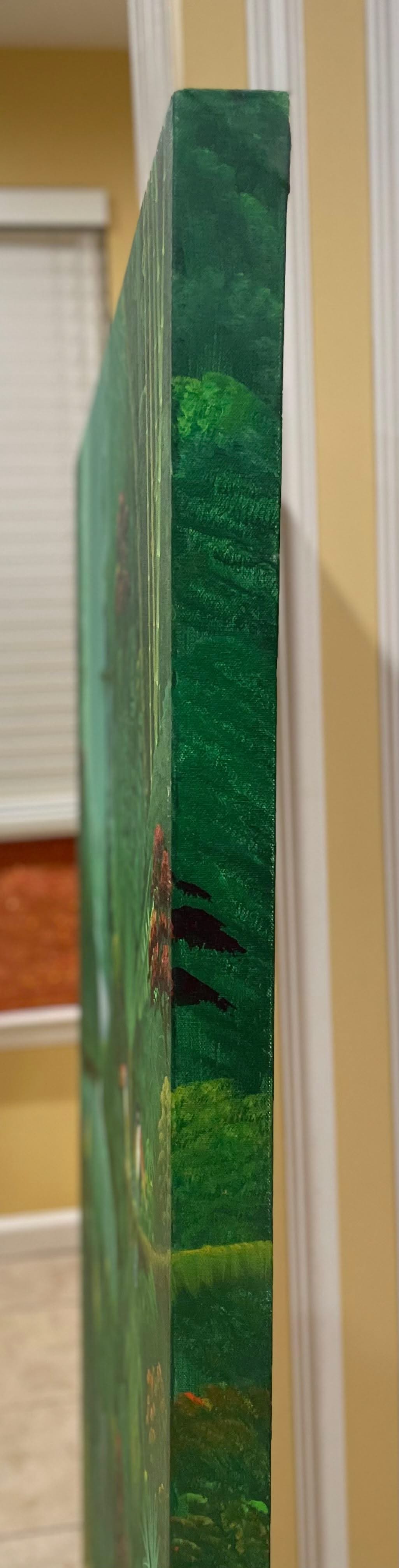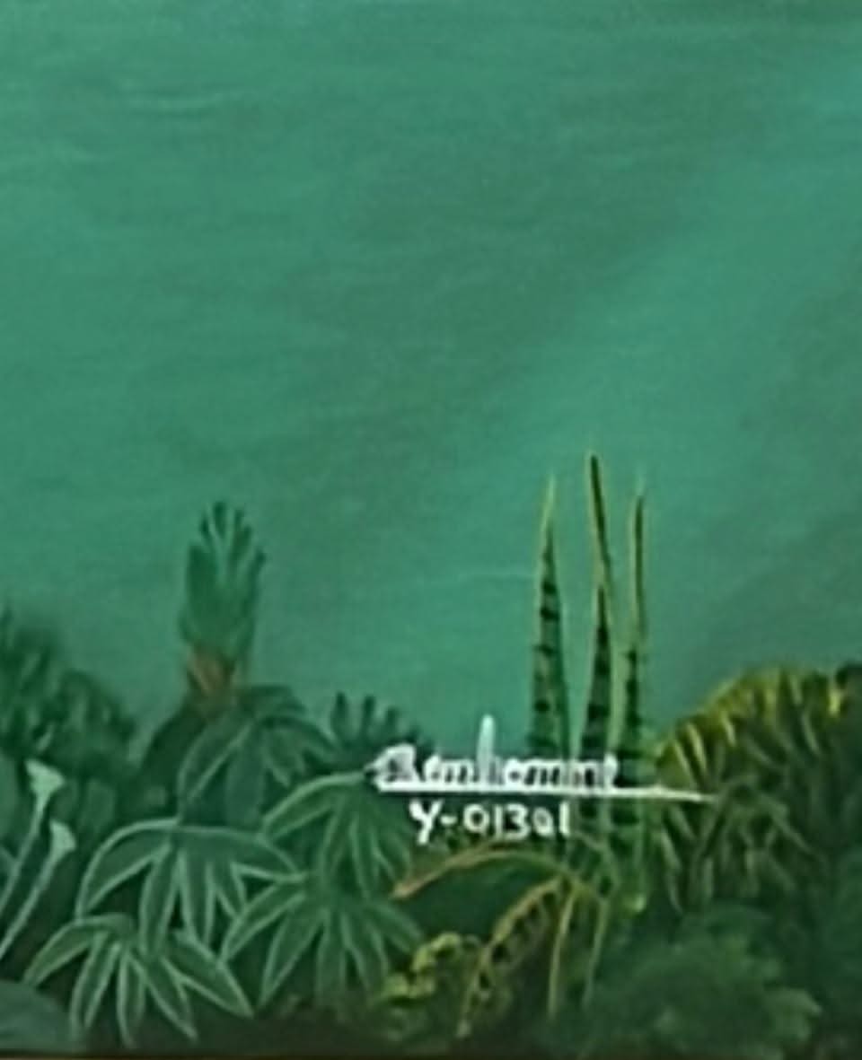 Albott Bonhomme, the renowned Haitian animalist painter, created this beautiful, big-sized 60"x40" original acrylic painting in 2023. It depicts a green tropical paradise with birds and water in lush vegetation. It is signed on the lower right side, with the inscription below Y-01301. The paintings' borders (2" thick) are painted all around, and there is no need to frame the artwork.