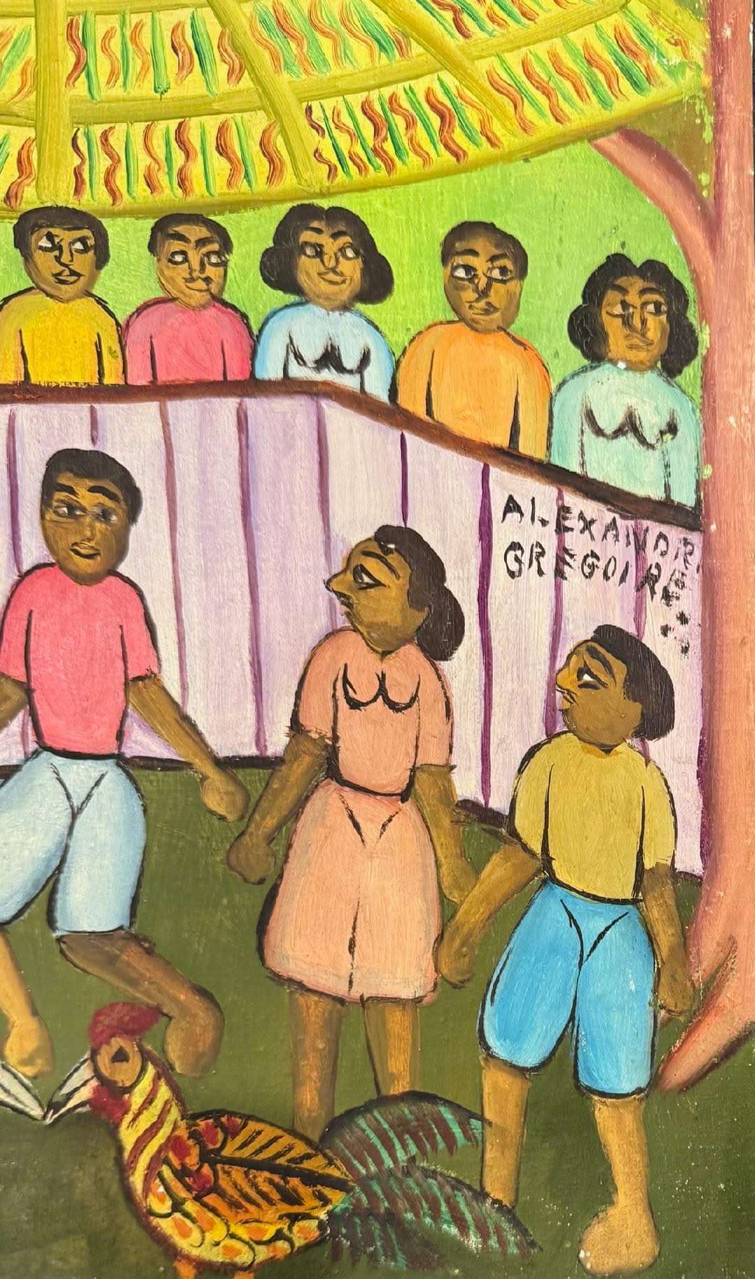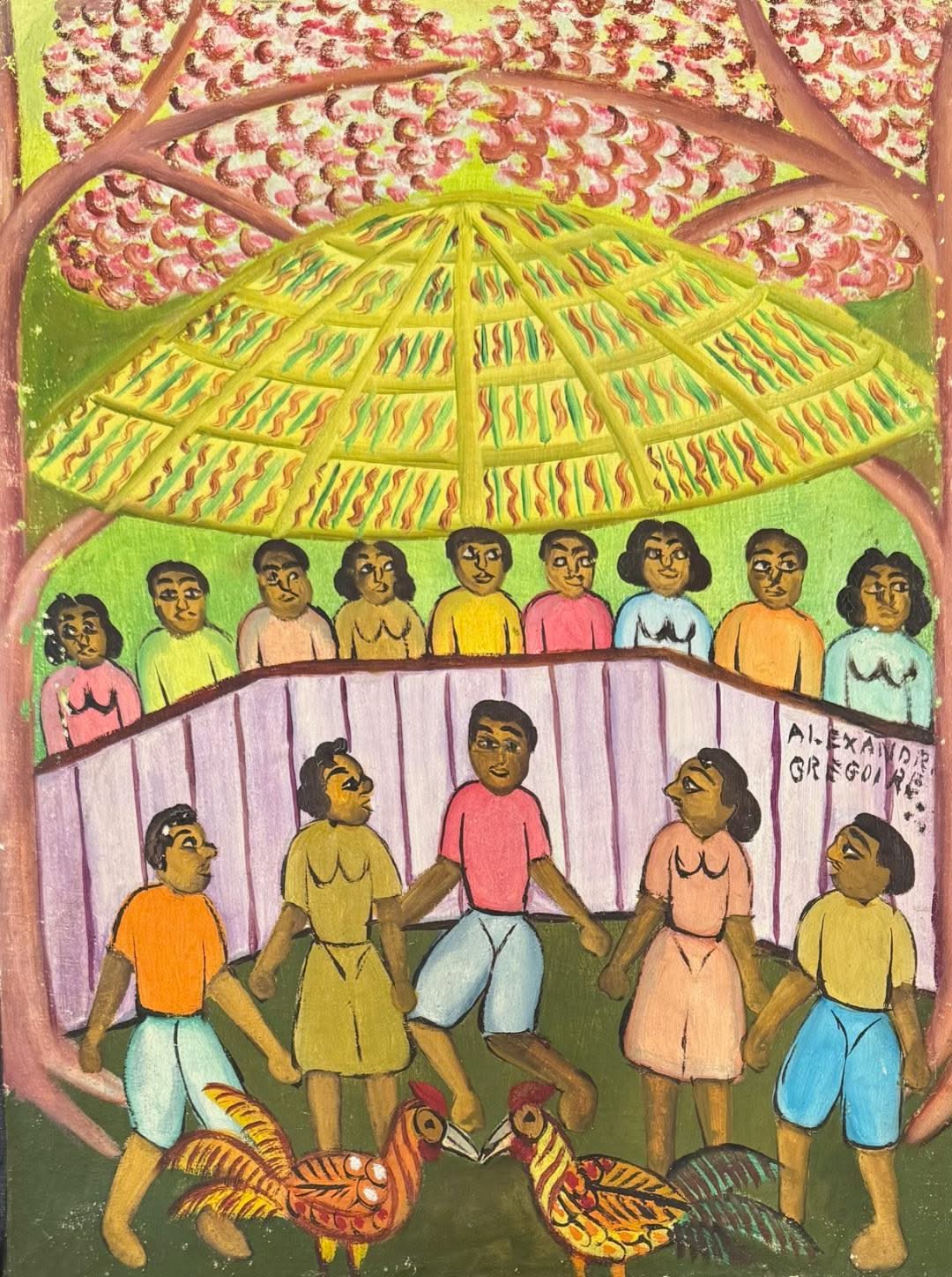 Alexandre Grégoire was a Haitian painter who typically depicted scenes of Vodou, daily life, and historical events in the naïve style. Born in Jacmel, Grégoire was educated from 1930 to 1937 by the Christian Teaching Brothers, and then studied cabinet making at the Jacmel vocational school for two years. In 1939 he joined the army and played the tuba and saxophone in the army band. He stayed in the army until the 1950s; during the presidency of Paul Magloire he left the military and joined the band at the National Palace. In 1968, with the encouragement of his friends Préfete Duffaut and Pierre-Joseph Valcin and the help of the Centre d'Art in Port-au-Prince, Grégoire began painting. Paintings by Alexandre Grégoire have been sold by the Friends of HAS Haiti to raise funds for the Hôpital Albert Schweitzer Haiti, located in Deschapelles. (Wikipedia)