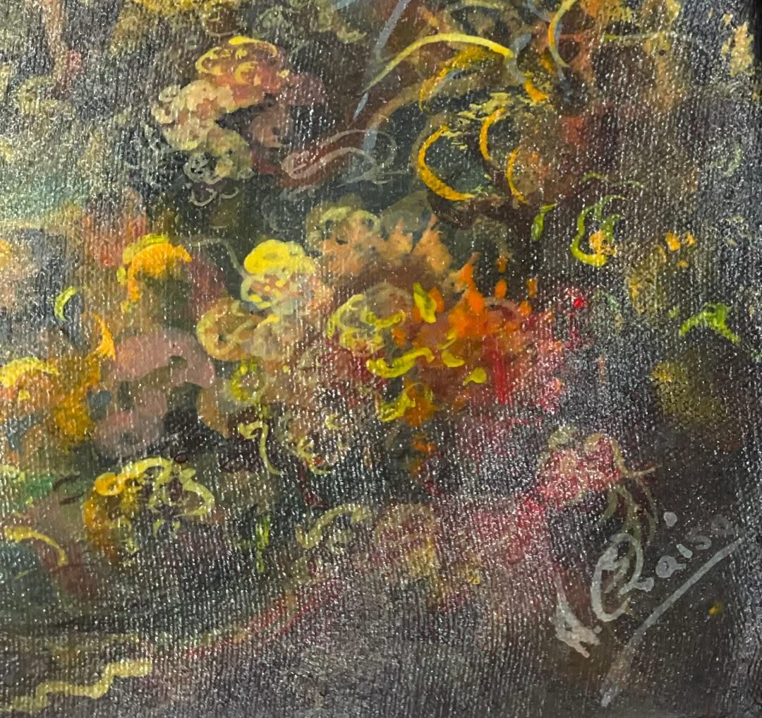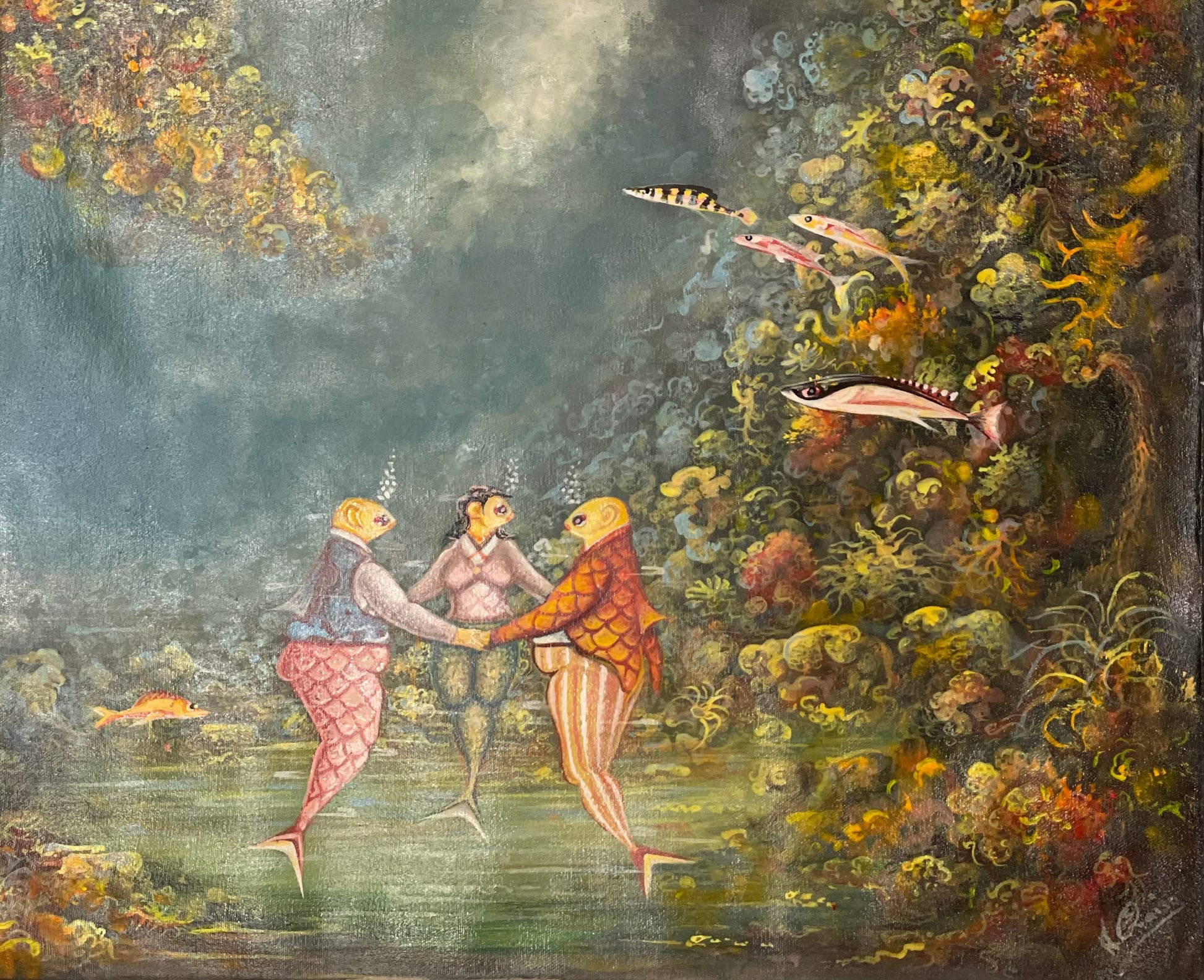 Andre Blaise, the Haitian artist, signed this 16"x 20" original painting depicting a fish-like trio holding hands undersea. It is an acrylic on canvas and in good condition. It's sold unframed.