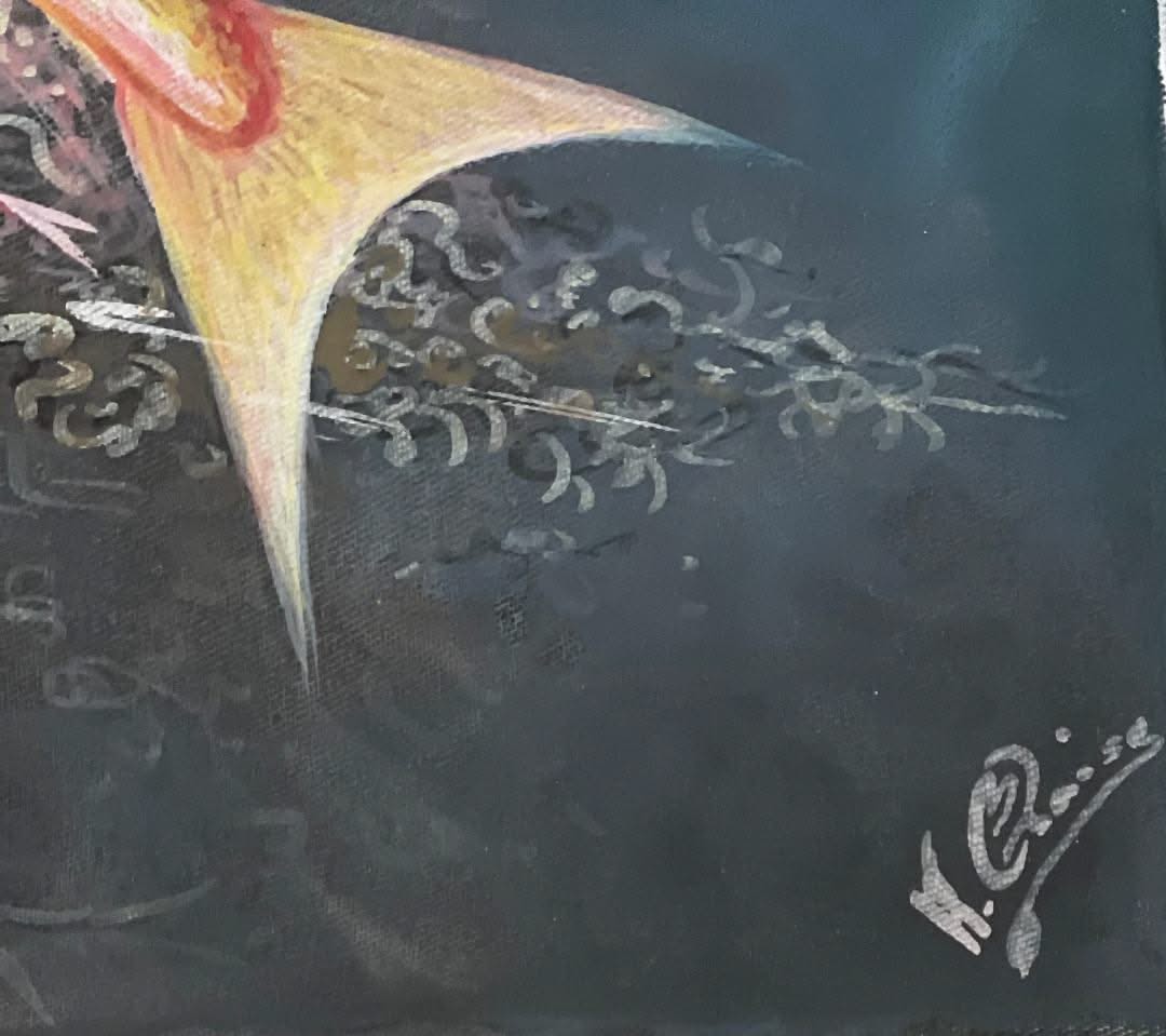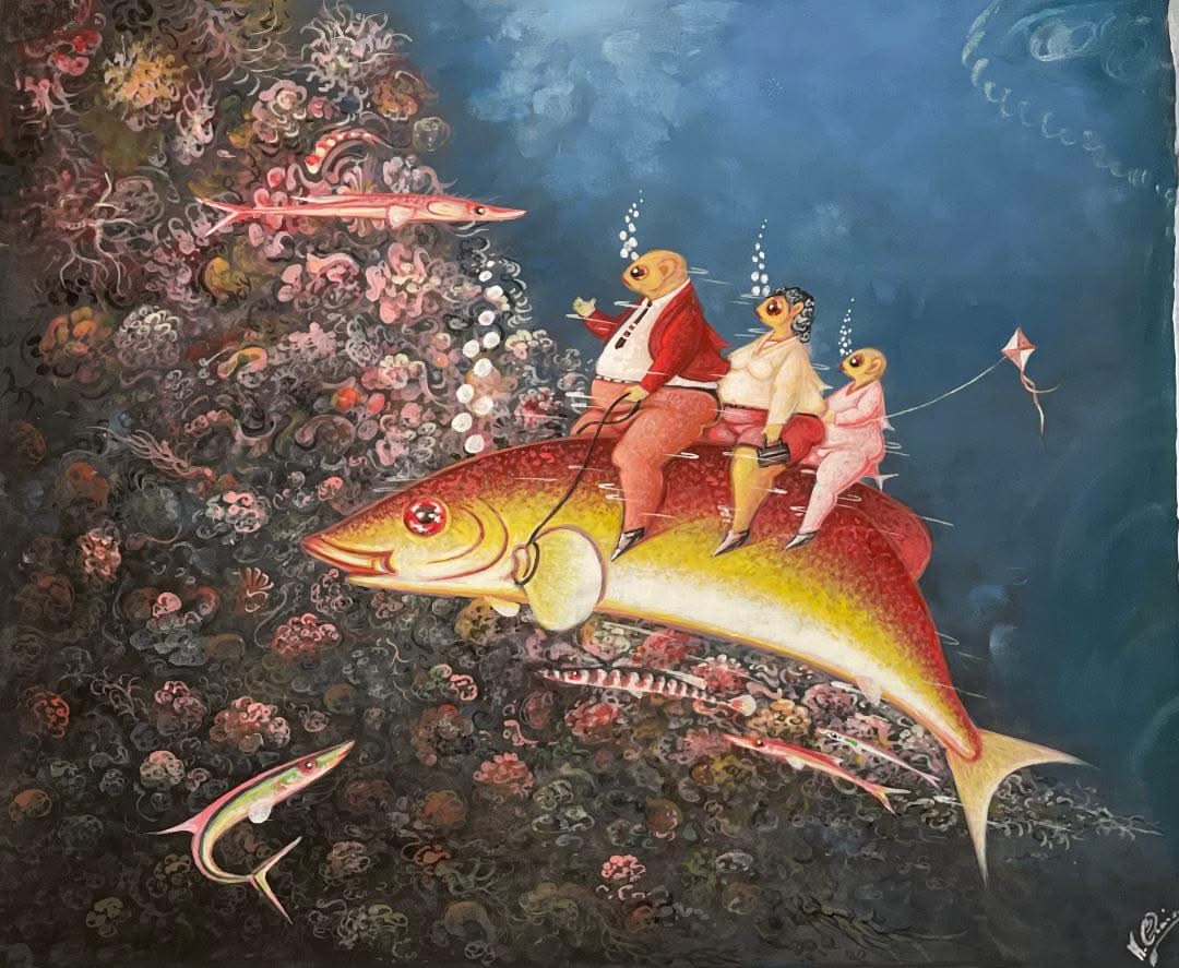The Haitian artist Andre Blaise signed this 20"x 24" original painting depicting a fish-like family members riding a big undersea. It is an acrylic on canvas and in good condition. It's sold unframed.