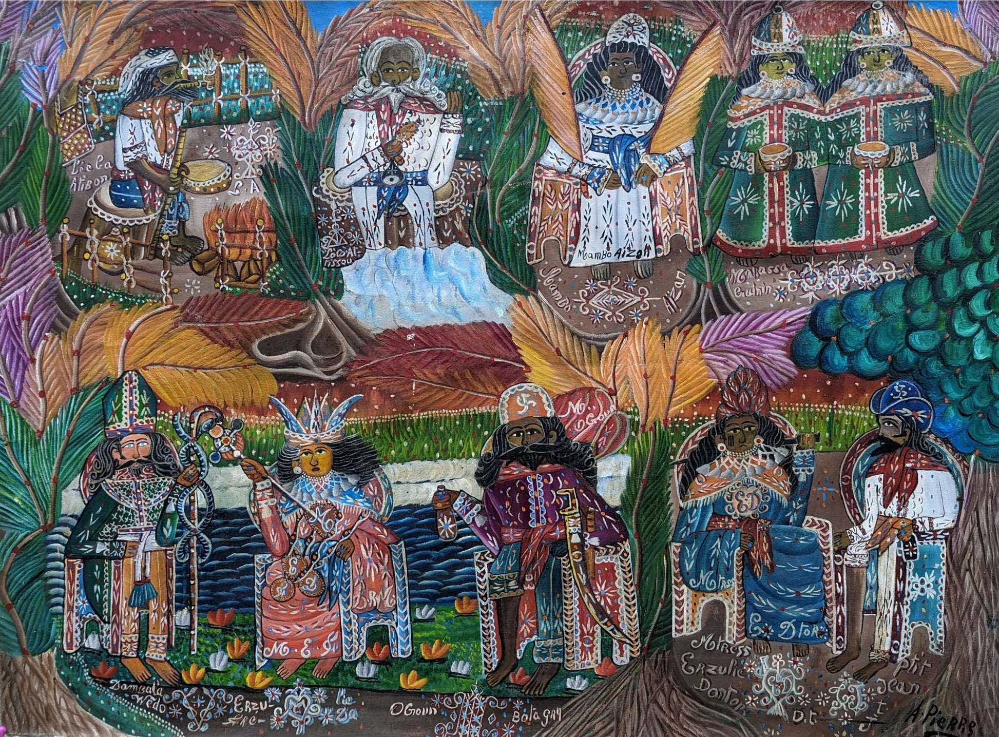 The late Haitian master Andre Pierre created this original 30"x40" vodou scene oil on canvas painting in 1991. It in good condition and sold unframed. It belongs to a private collector in Florida, where the painting will be shipped. A certificate of authenticity will be issued upon purchase.