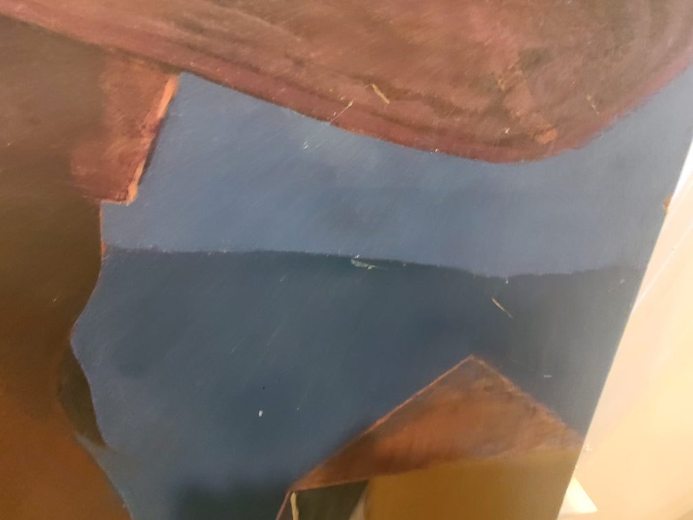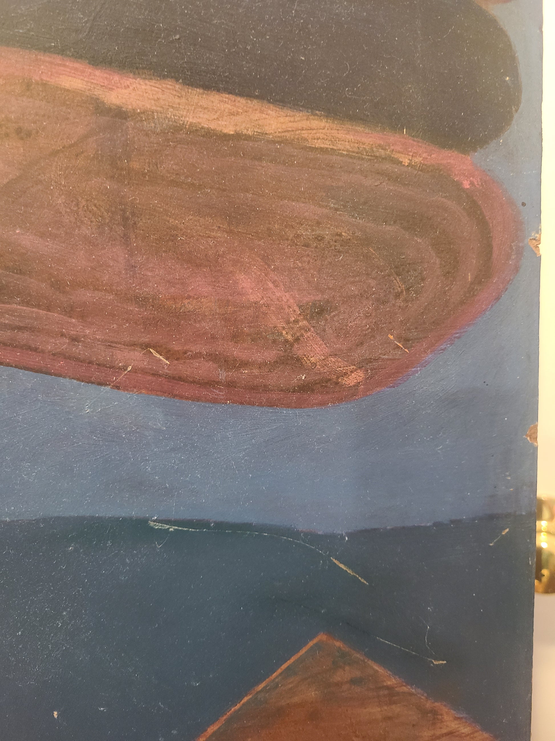 This painting depicts a fabric seller viewed from the back. It measures 36" x 32" and is an acrylic work on masonite, signed and dated "Bernard Sejourne 78" in the lower right corner. The artwork is sold unframed. Due to its age, the painting has some scratches, but these are barely noticeable when viewed as a whole. A frame would cover the imperfections on the sides. It comes from a private collection in Wilton, CT, where it will be shipped from. The gallery will provide a certificate of authenticity upon purchase.