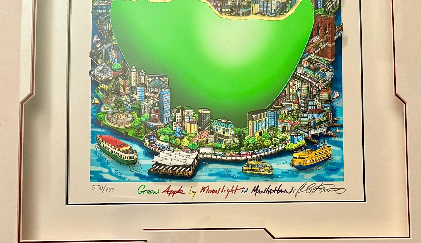 'Green Apple by Moonlight in Manhattan' is a 3-D relief serigraph in color with mixed media embellishments on paper. Hand-signed in ink lower right by the artist. From the Arabic numbered 950 examples (140 Arabic numbered artist proofs, 140 Arabic numbered European artist proofs, 140 Arabic numbered hours commerce proofs, 140 Arabic numbered printer proofs, and 3 Arabic numbered bon a tirer proofs also exist) signed in pencil, lower right, and monoprint light blue to lower left. Once printed, each image is meticulously cut, assembled, and embellished by hand. It comes with a certificate of Authenticity from Park West Registration No. 990353.0530