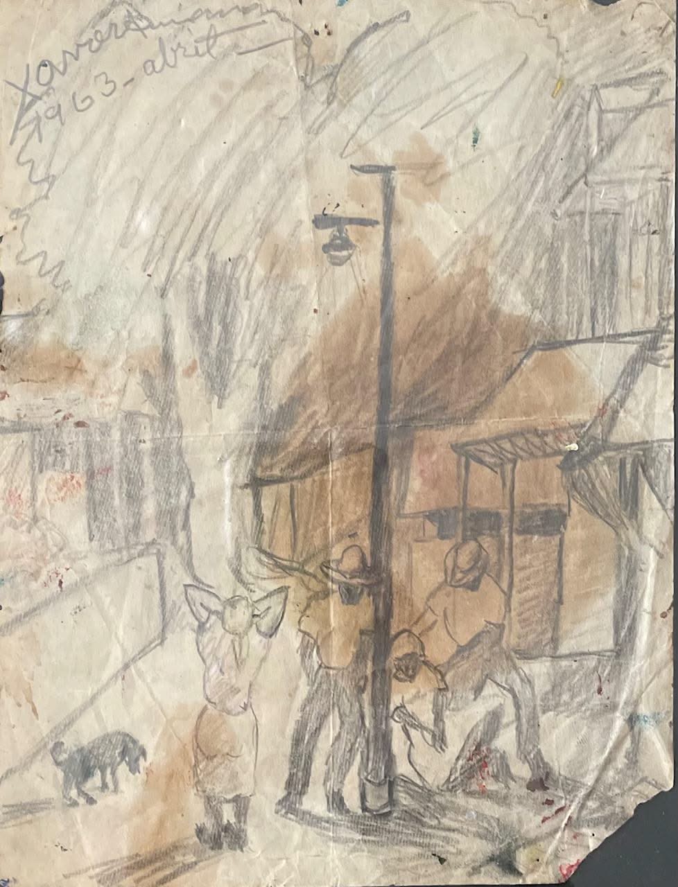 Xavier Amiama, the late famous painter, created this rare miniature vintage 8"x6.25" series of drawings of a man under a lantern made in black & colored ink and pencil. It is ripped on the left sides, signed & dated April 1963, in the upper left corner, and will be shipped from New York. It is from the private collection of Myriam F. Nader.
