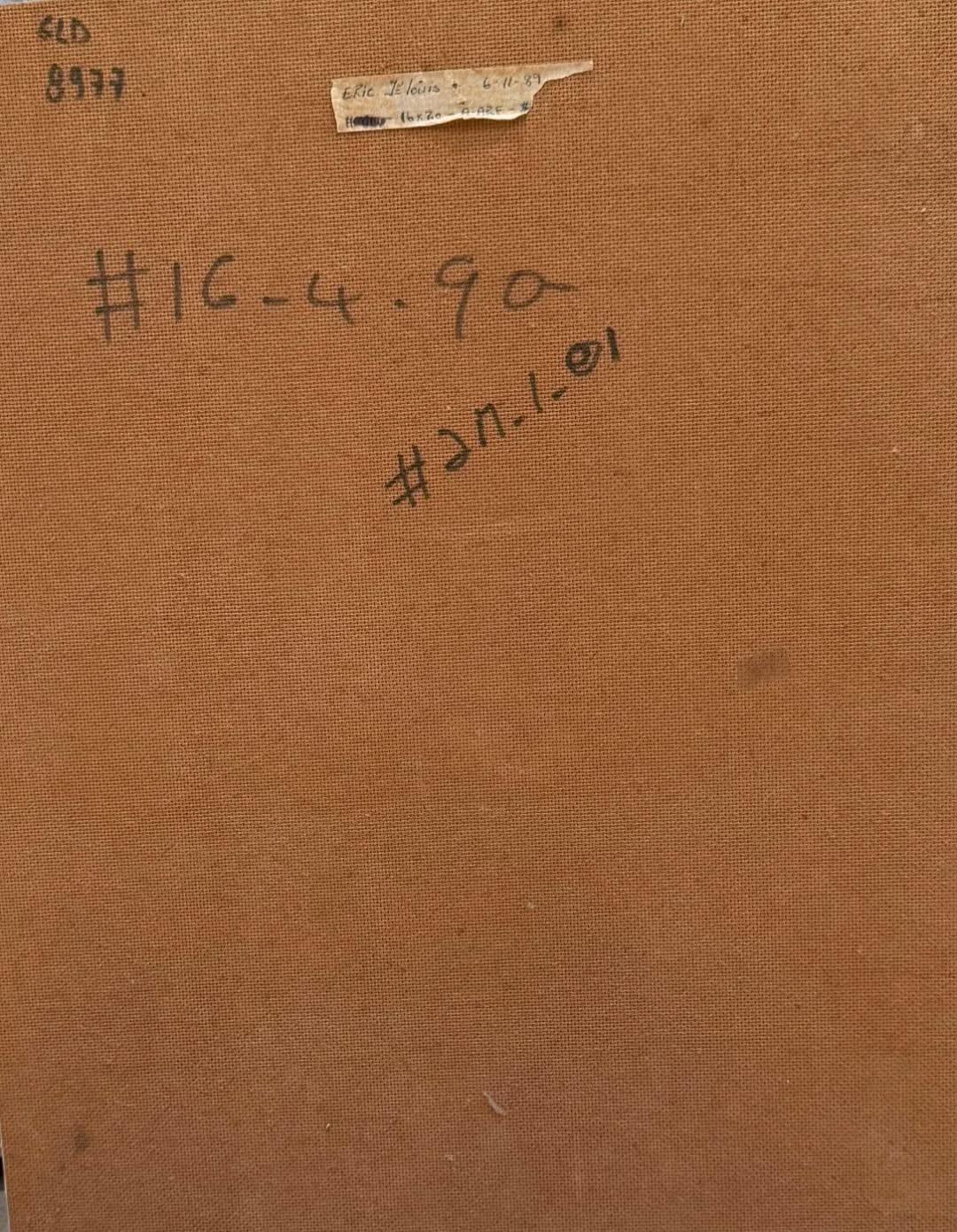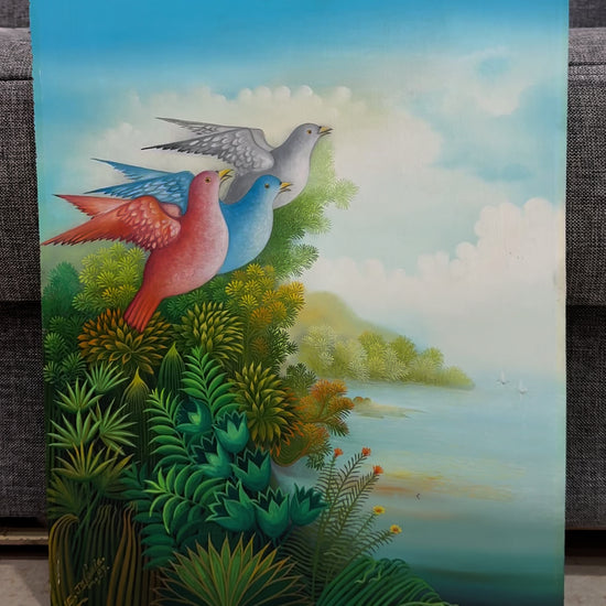The late renowned Haitian artist Eric Jn-Louis painted this peaceful scene of three colorful birds in 1989 on oil on board. This painting is in good condition, sold unframed, and signed in the lower left corner. This artwork belongs to the private collection of Myriam F. Nader.
