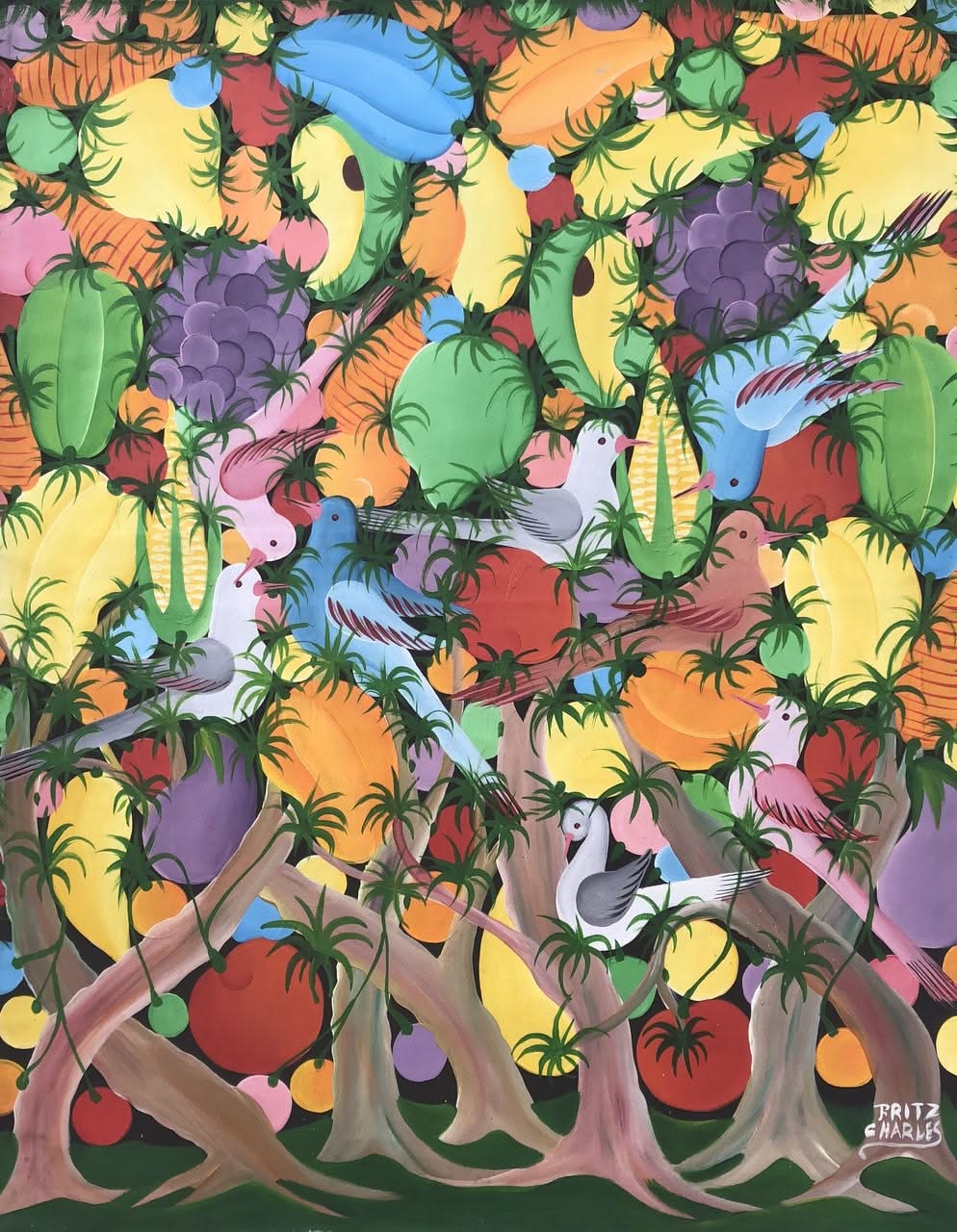 This is a primitive vintage painting signed by the Haitian artist Fritz Charles. This painting depicts few colorful birds eating from several trees. It is an original oil on canvas from the 1980's, sold unframed. Free Shipping!