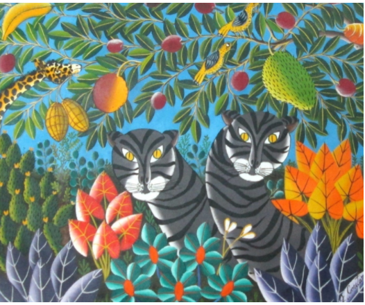 Gabriel Coutard was born in 1965 in St Marc, from farming parents; he studied until the third, then arrived young in Port-au-Prince, where his uncle Gabriel Alix taught at the Art Center. He also works in the factory. He began painting in 1980, with a preference for the jungles, especially with panthers and tigers.