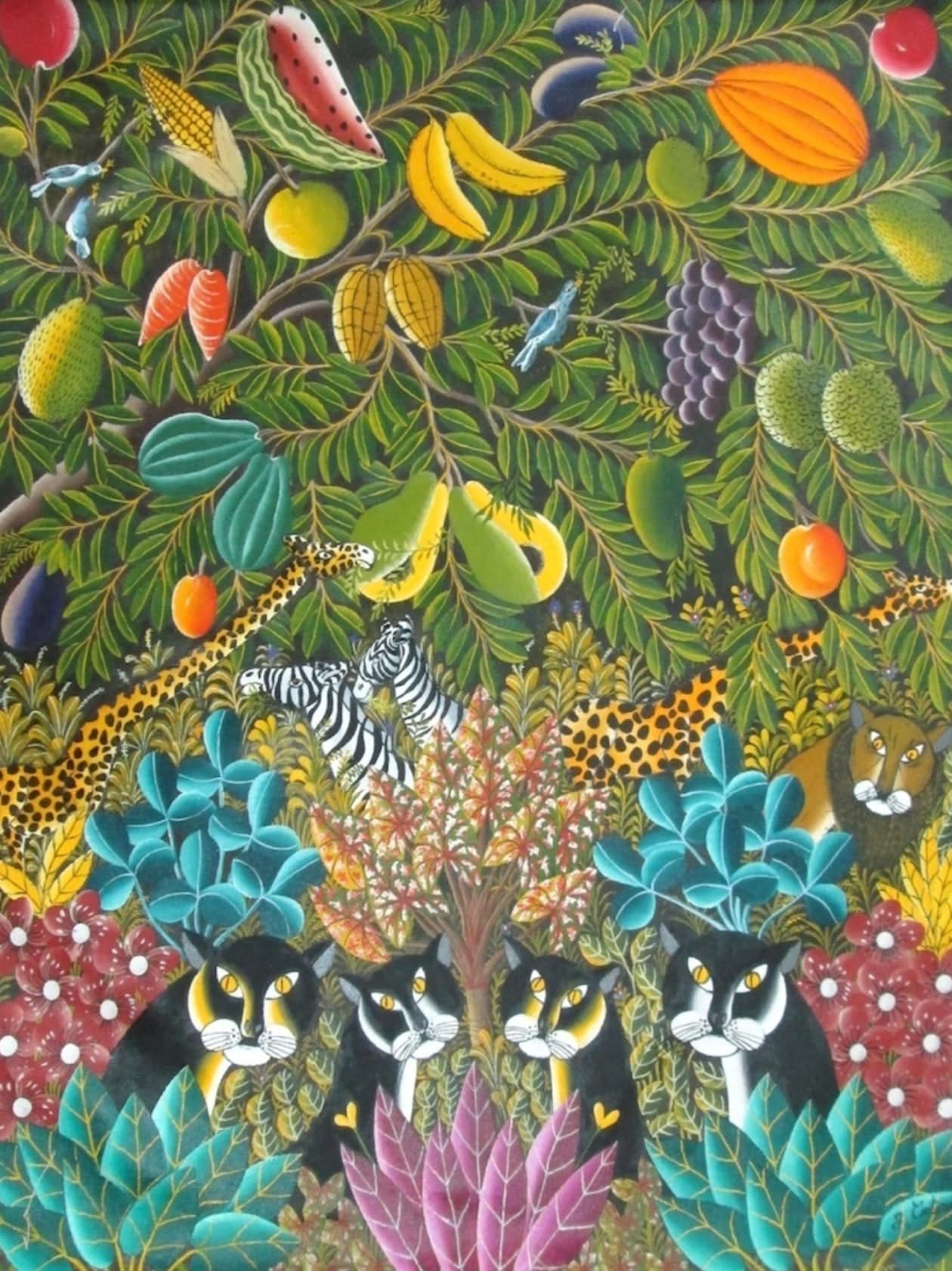 Gabriel Coutard was born in 1965 in St Marc, from farming parents; he studied until the third, then arrived young in Port-au-Prince, where his uncle Gabriel Alix taught at the Art Center. He also works in the factory. He began painting in 1980, with a preference for the jungles, especially with panthers and tigers.