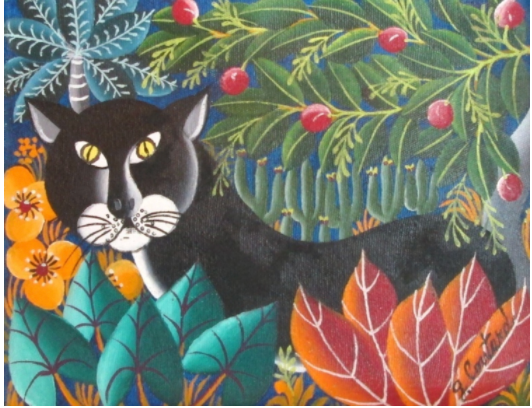 What a beautiful small jungle scene painting created by the well-known Haitian artist, Gabriel Coutard! It depicts a panther in a jungle.