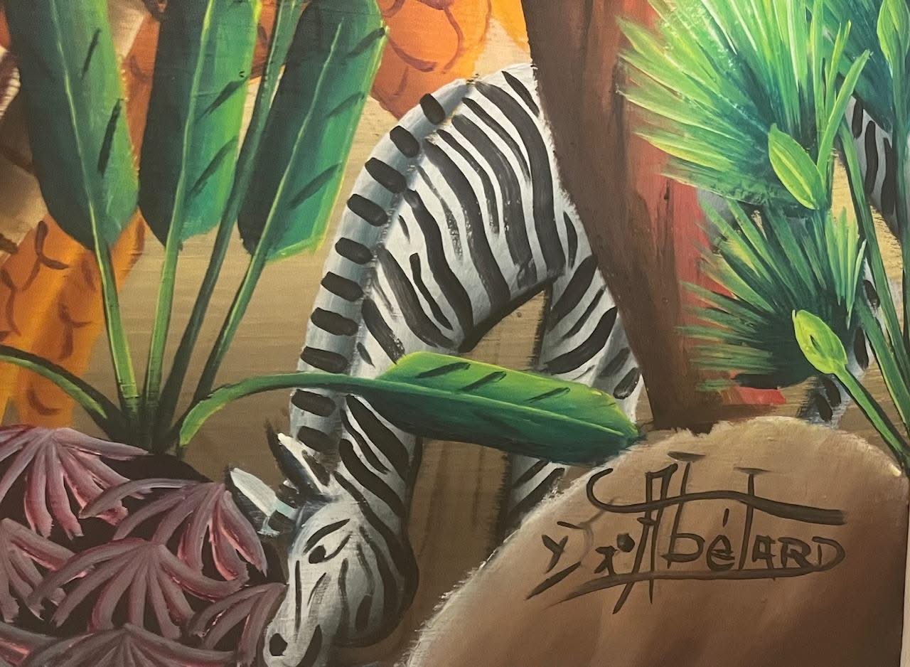 This richly detailed oil on board painting by Gesner Abelard presents a vibrant depiction of Adam and Eve in a lush, Eden-like paradise filled with dense tropical foliage and exotic wildlife. Abelard’s imaginative rendering combines symbolic Biblical narrative with the distinctive palette and stylized forms of Haitian art. Giraffes, zebras, tropical birds, flowering plants, and layered palm fronds frame the serene central figures, creating a dreamlike environment that blends innocence, beauty, and cultural reinterpretation. The warm gradient sky and intricately textured vegetation reveal the artist’s mastery of color harmony and decorative composition. This work comes from a private collector in New York and will be shipped directly from the collector. A Certificate of Authenticity will be issued by Myriam Nader Haitian Art Gallery upon purchase.
