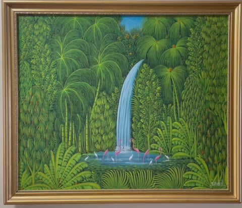 Henri-Robert Bresil 20"x24" Verdant Vegetation with Flamingos, Birds, Ibis & Cascade Oil on Canvas #2MFN