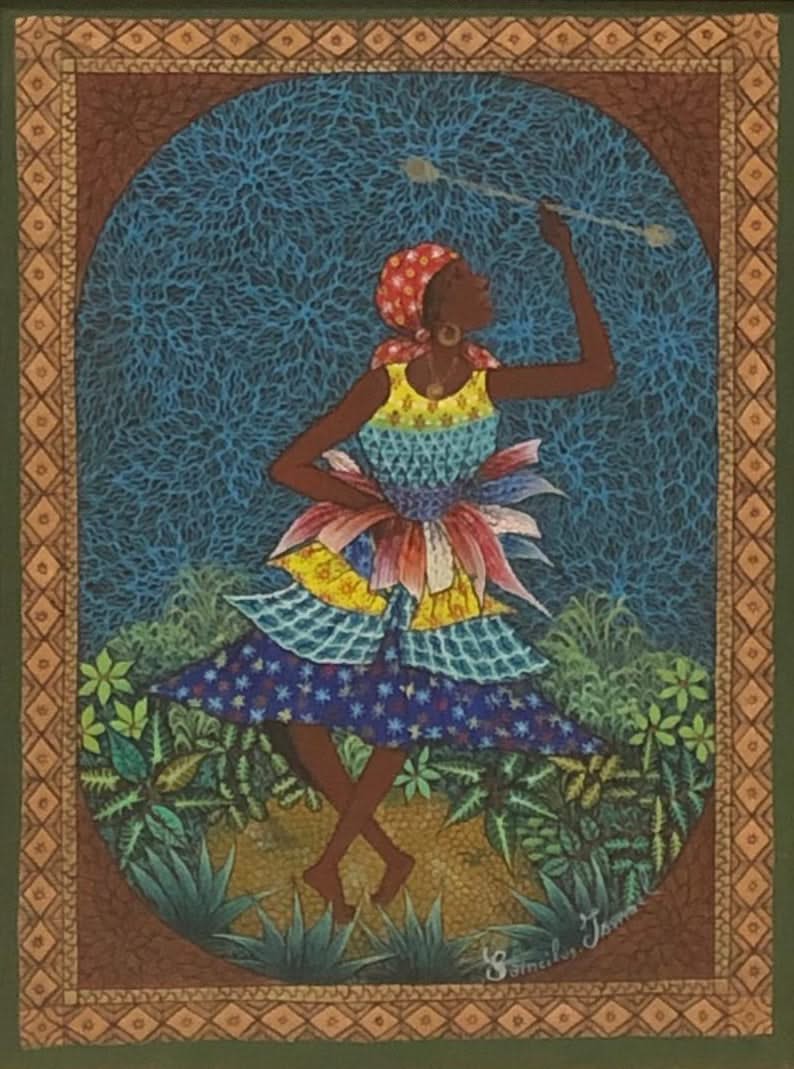 A beautiful authentic and detailed Haitian dancers painting duly signed by the late Haitian artist, Ismael Saincilus, Artibonite School Master to add to your collection! It's a 16"x12" oil painted on canvas.
