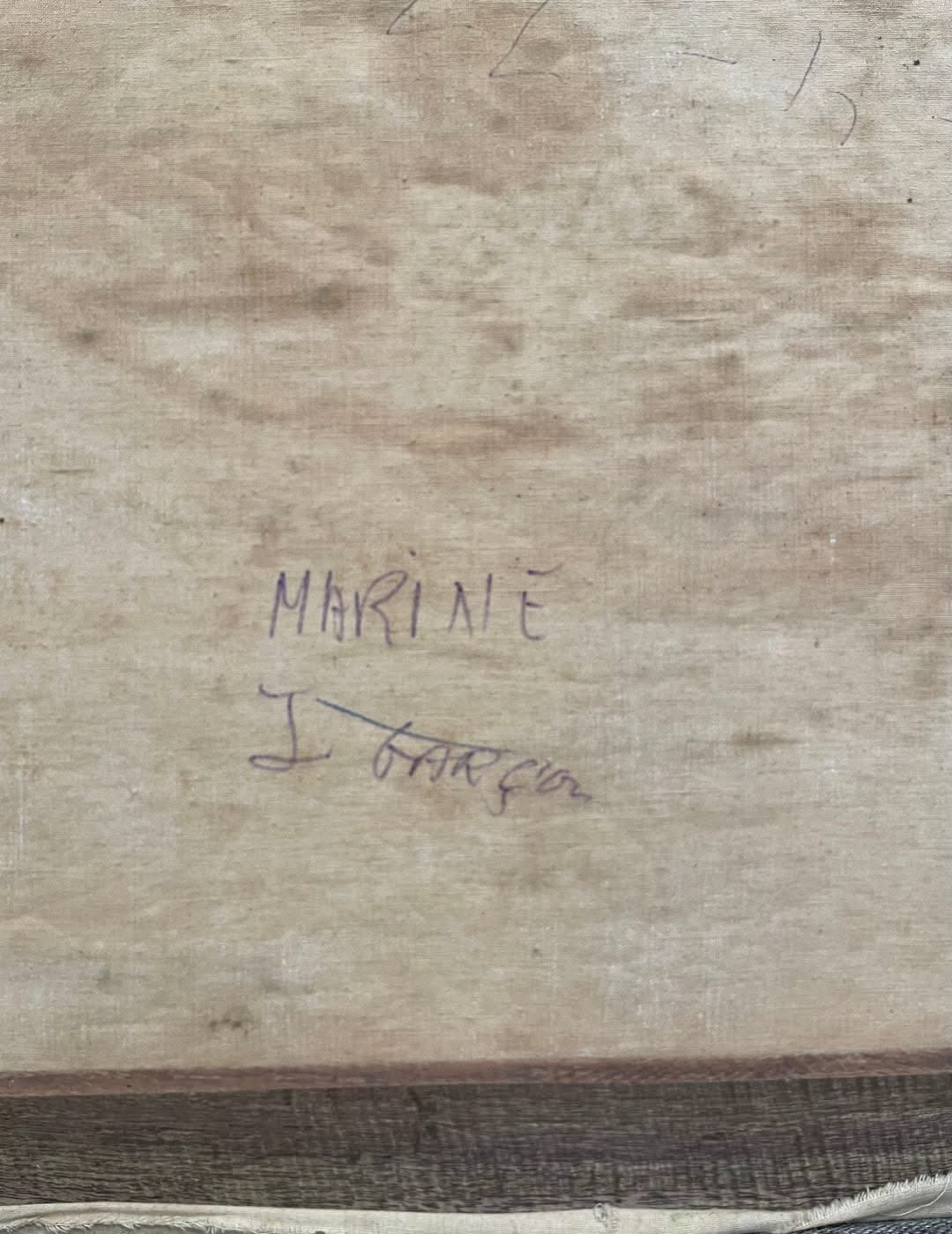 This beautiful vintage painting depicts a marina scene with an intense palette knife. It's an original 24"x32" oil on canvas titled "Marine" in the back, created in 1973. It is signed J. Garcon, a.k.a Jacques Garçon, in the back and the lower right corner, from the collection of Myriam Nader. It is sold unframed and has minor cracks.