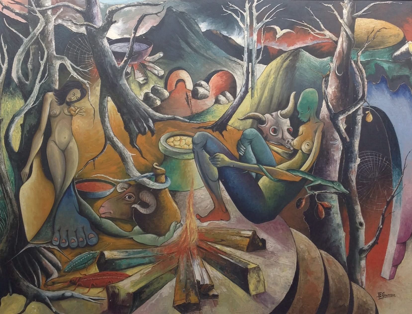 J.E. Gourgue was born in Port-au-Prince in 1931 and died in 1996. He was undisputedly the leading figure in modern Haitian painting. He joined the Centre d"art in 1947. Gourgue had his own distinguishable style, featuring the Haitian mountains, skeletal trees, peasants and their huts, and Vodou symbolism in a surrealistic way. His art was exhibited in the Museum of Modern Art in N.Y, including at the Sotheby and Christies auction houses, Europe, North America, and Latin America.