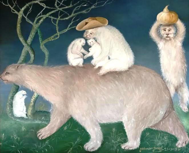 Signed and dated Jasmin Joseph 27-9-94 on the lower right corner, this painting depicts a beautiful animal promenade scene in the jungle in pastel colors. This painting belongs to a private collector.