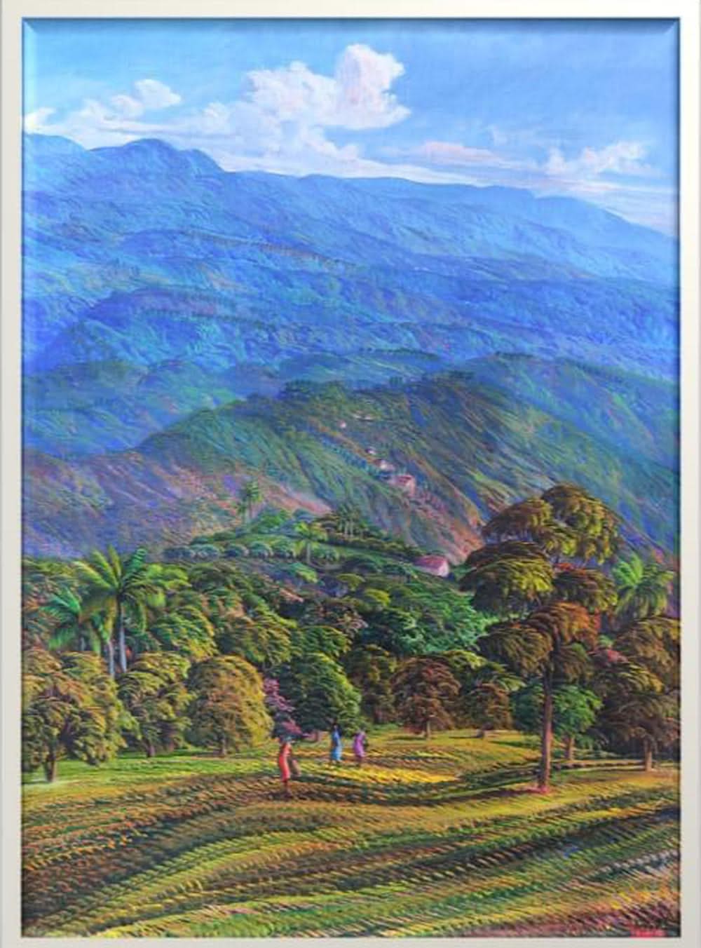 Self-taught Haitian artist Jean Adrien Seide was born in Cayes in 1952. He moved to Venezuela when his father passed away. He paints exceptionally structured landscapes, with a series of fields spreading out towards a distant horizon. At first glance, his paintings look representational, but a more detailed examination leads to a fascination, and the fantastic element predominates over the immediate reality.