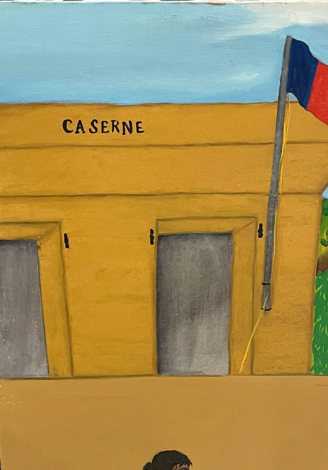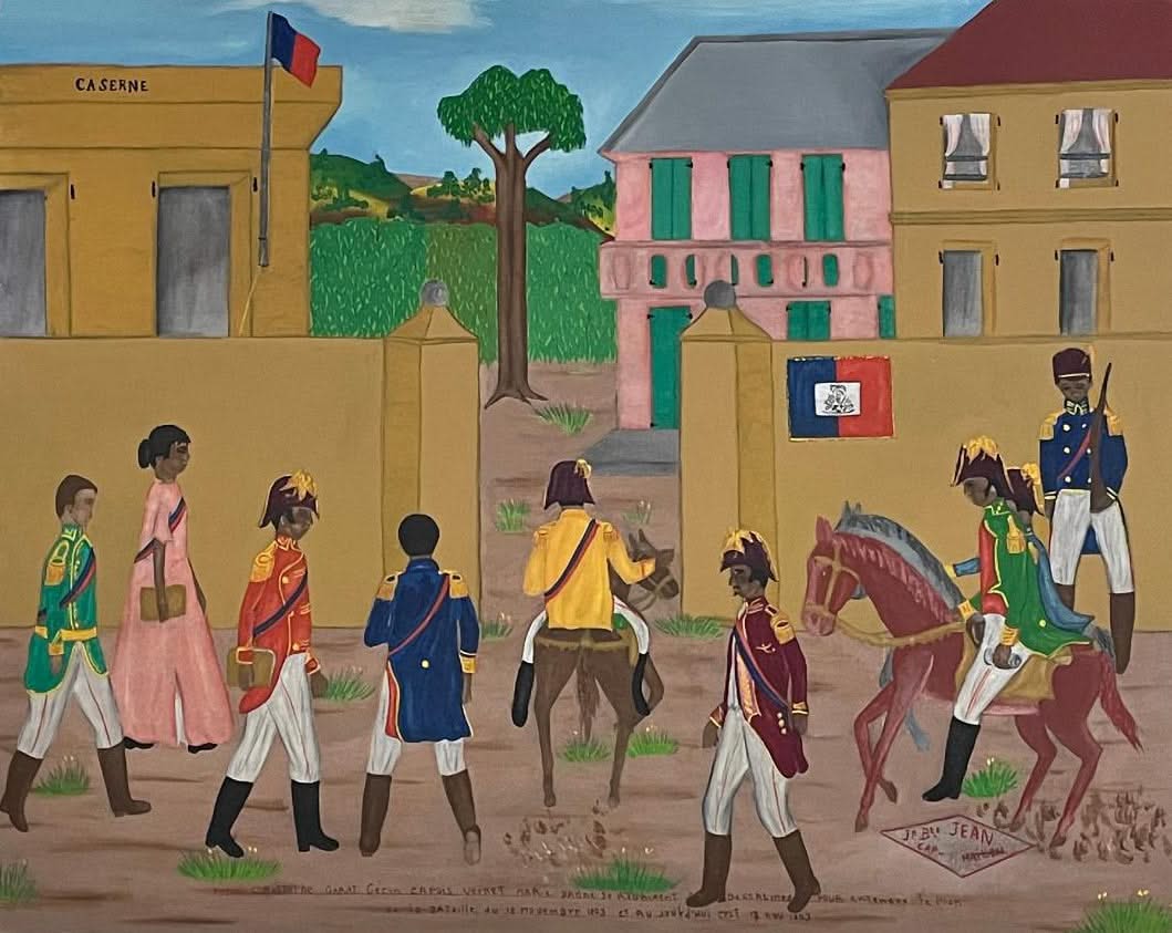 This painting is a vintage historical piece signed by the late Haitian painter from Cap-Haitian Jn-Baptiste Jean dated in 1973. The famous Battle of Vertieres was the last major battle of the Haitian Revolution, and the final part of the revolution under Jean-Jacques Dessalines. It was fought on November 18, 1803, between the Haitian indigenous army, and Napoleon's French expeditionary forces, who were committed to regaining control of the Island.
