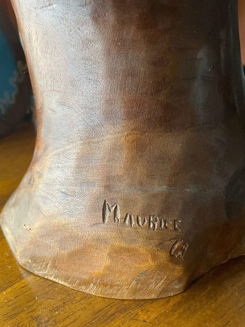 Haitian classical twin sculptors Jean-Baptiste and Joseph Maurice were born in Cap-Haïtien, Haiti 1932. Their introduction to woodworking began at fifteen in a cabinetmaking workshop in their hometown. A growing interest in this material led them to the Professional School of Cap-Haitien, where they worked on ornamental pieces that brought them closer to sculpture. They follow a correspondence course in artistic anatomy to devote themselves entirely to it. In these courses, it is a question of learning from drawn plates showing the body at rest or in movement, plates which are, in a way, figurative descriptions. This learning is essential for any artist who wants to represent the human body faithfully. This teaching shows the artist's intelligence in the shapes that appear on the body's surface. When these forms become apparent to the artist, they can be faithfully rendered in sculpted material or a drawing. The Maurice twins learned well, and together, they created works of which some have said: "All they lack is speech." The characters – especially women – sculpted are undeniably Haitian. They are by clothing and also by facial features. We do not know the processes used by the Maurice brothers, but they likely worked from live models to make preliminary sketches. Having only Haitian models, respecting the entirety of the model, they necessarily created Haitian images. When Joseph Maurice died in 1977, the twins' production was greatly affected. (Source: Gerald Alexis, Le Nouvelliste, May 2017). A sculpture by the Maurice twins is a rare collectible and valuable in the art market.