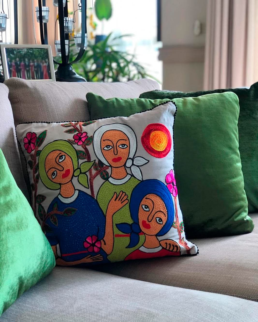 "Women & Flowers" is a beige background Cotton for Cushion embroidered by the known naif Dominican artist Jose Morillo to add to your decor.