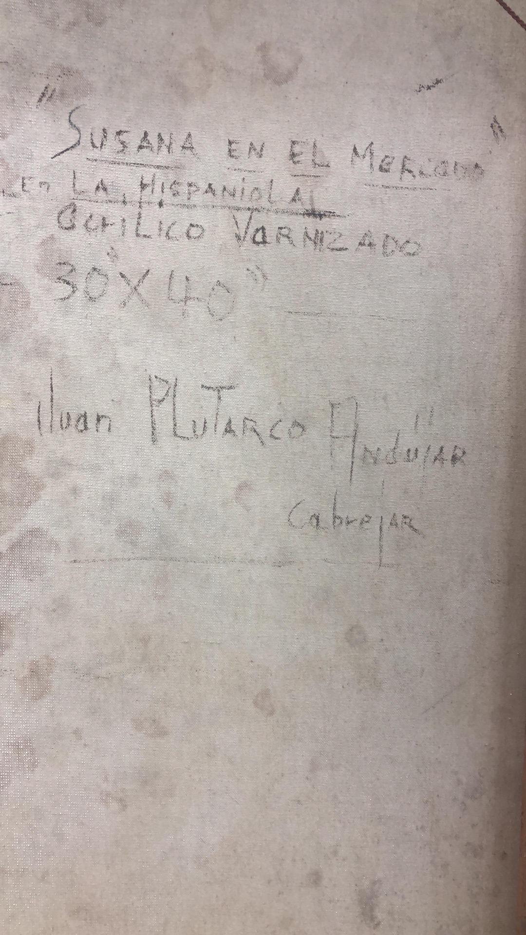 The late renowned Dominican artist Juan Plutarco Andujar signed the back of this beautiful market scene titled "Susana en el Mercado en la Hispaniola" (Susana in the Market in Hispaniola). It is currently owned by a private collector in the Dominican Republic and will be shipped directly from there. Our gallery will provide a certificate of authenticity with the purchase.