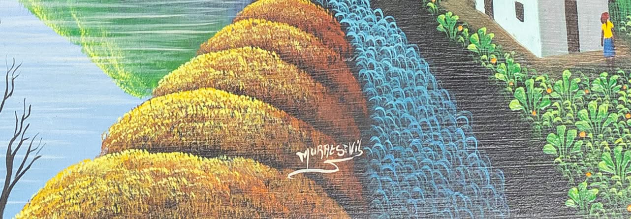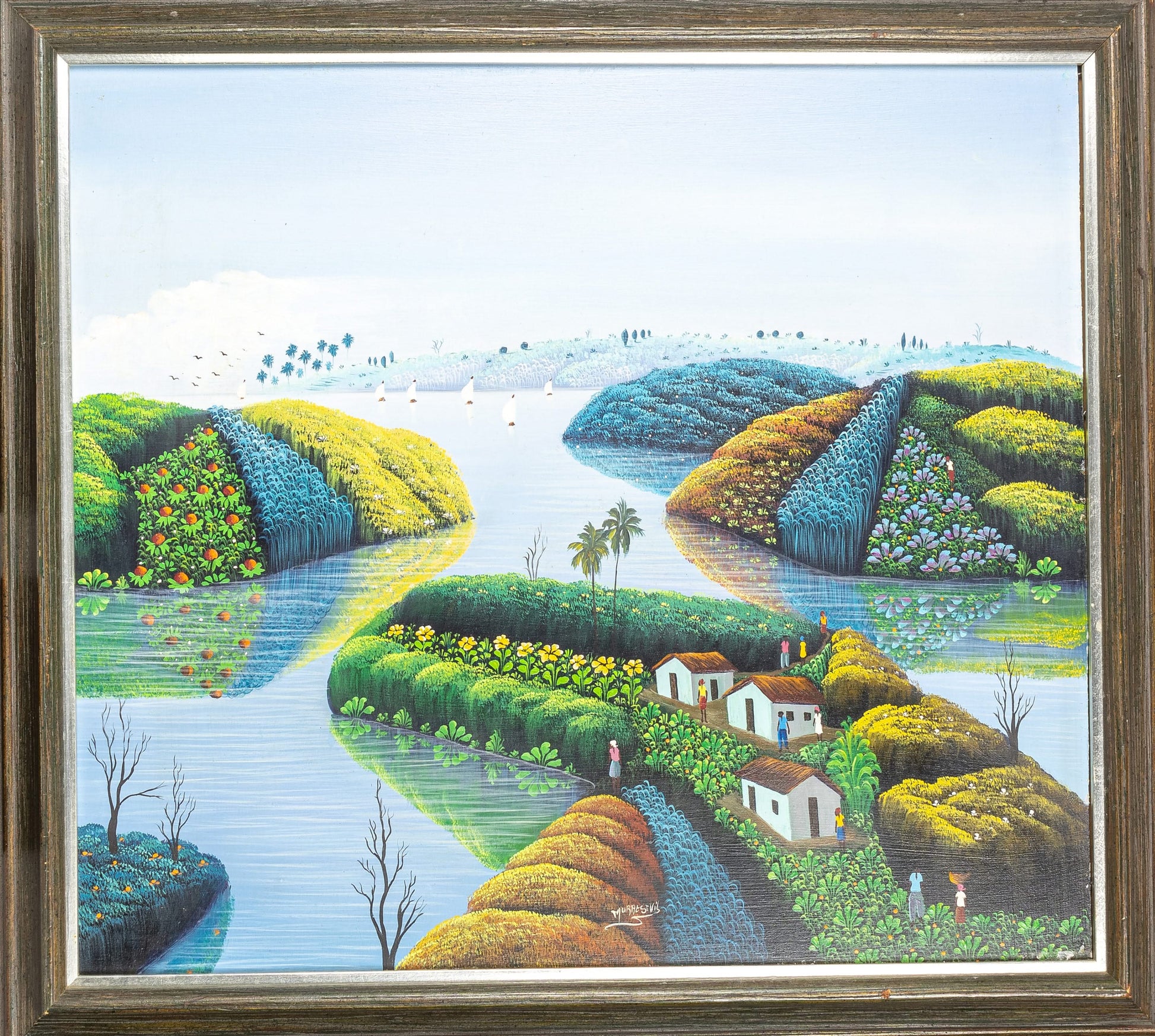Murat St-Vil, the Haitian primitive painter painted this original painting of villages on islands on masonite and signed it on the frontal lower center. The painting is in good condition, framed (23 ⅓" x 26 ⅓") and will be shipped by a private collector in Caracas, Venezuela. Our art gallery will issue a certificate of authenticity upon purchase.