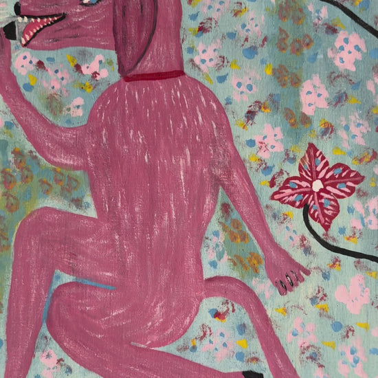 This striking Haitian painting by Gérard Fortuné, portraying a whimsical pink dog-like figure singing amidst bold floral patterns, is part of Myriam F. Nader’s private Haitian art collection and was exhibited in 2016 at Diaspora Calling! in Brooklyn’s historic Kings Theatre, a landmark show curated by the acclaimed singer Lauryn Hill that celebrated the creativity, vitality, and international influence of Haitian art. Fortuné’s works are highly prized by collectors worldwide for their originality, vibrant colors, and cultural significance. This piece presents a rare opportunity to own a museum-exhibited painting by one of Haiti’s most cherished artists.