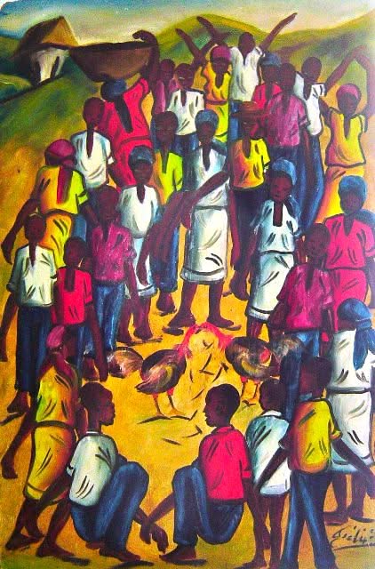BUY NOW this primitive painting signed by the late and known haitian artist Felix Jean who died in 1979. This painting represents a cock fighting scene in Haiti as seen by the artist. It is an original vintage oil on masonite painted in 1972. It is torn on top left corner. Sold unframed and As Is.