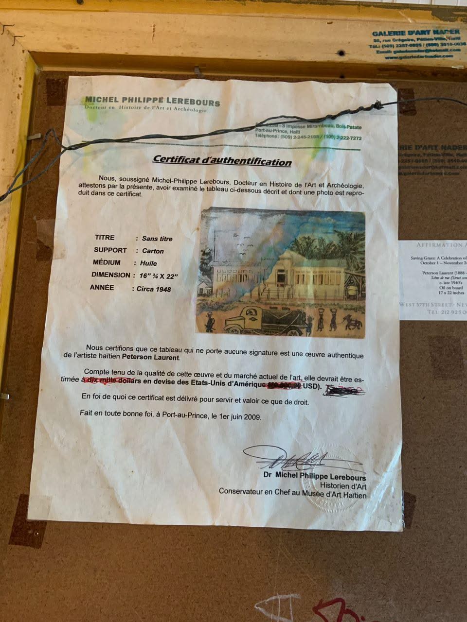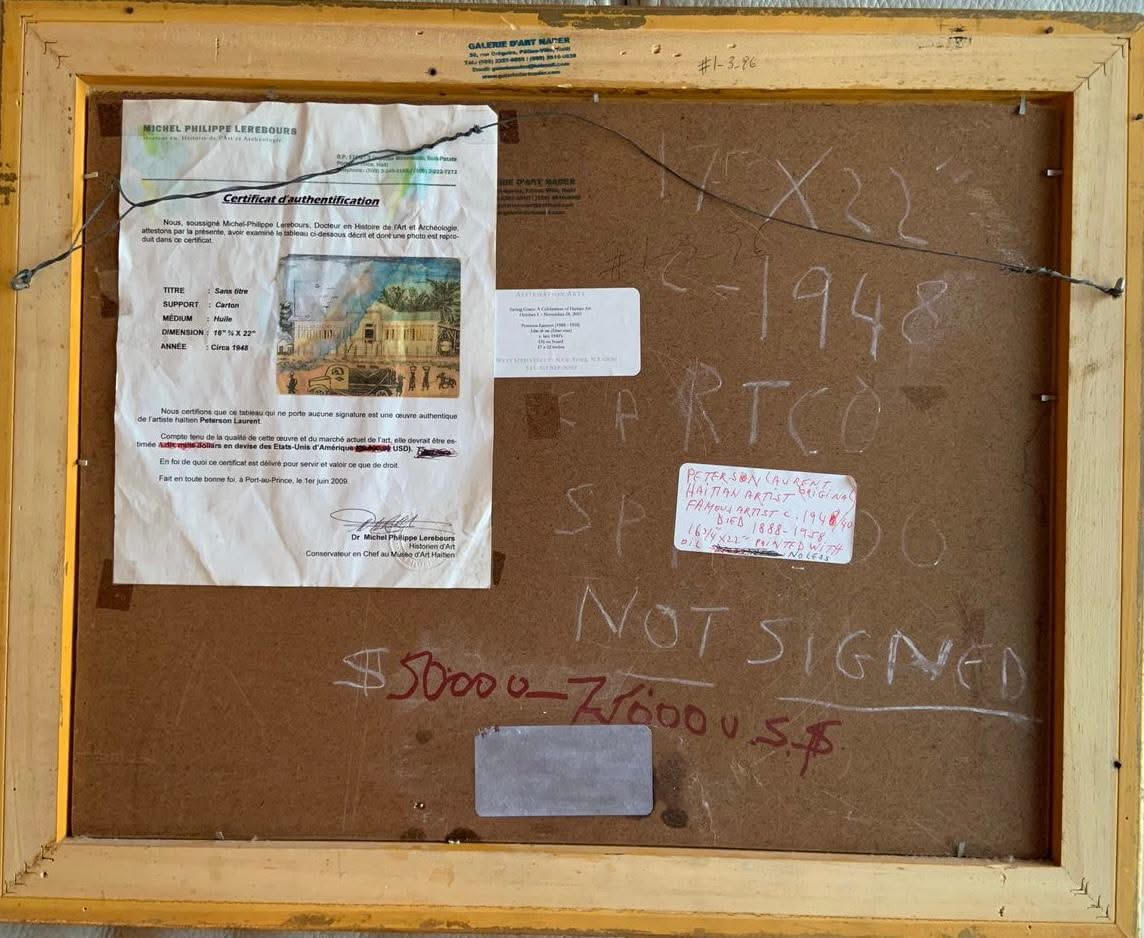 Add to your Haitian art collection this stunning old piece c1948 by Peterson Laurent, one of the old late Haitian masters. The painting bears no signature but comes with a certificate of authenticity from Haitian art critic Michel Philippe Lerebours attached to the back of the artwork.
