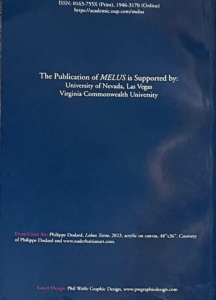 "LAKOU TAINO" is a vibrant 48"x36" abstract painting created by the Haitian contemporary master painter Philippe Dodard to add to your collection! This original piece of acrylic canvas dated 2023 is sold unframed and is in excellent condition. It is published in color on the front cover of MELUS, Multi-Ethnic Literature of the United States + in black & white on the inside page, Volume 48, Number 3-Fall 2023