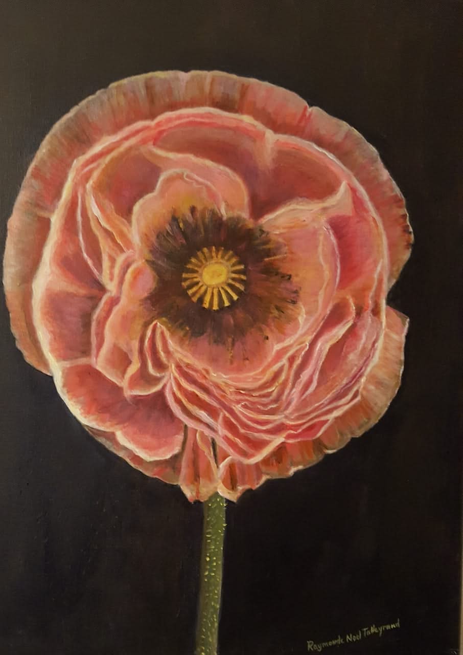 In this painting, one single large flower captivates the artist's attention. Rose petals of different tones, in layers reflected light in different ways. They all reunited in the center. What a natural beauty!