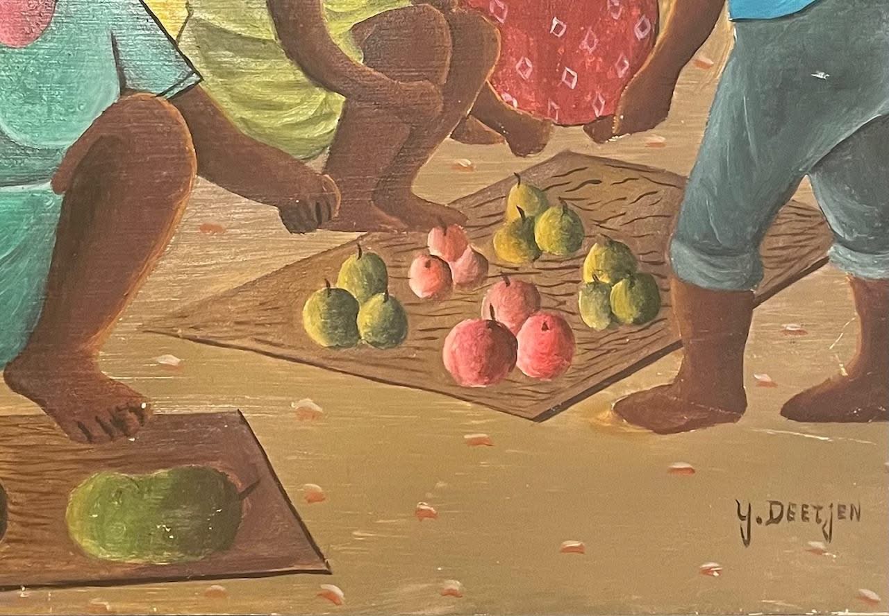 Self-taught Haitian painter Yves Deetjens signed this original vintage oil on board painting on September 16, 1980. It depicts a market scene in Haiti with a green female seller in a primitive style at the center. It is sold unframed. This art was initially bought from the artist.